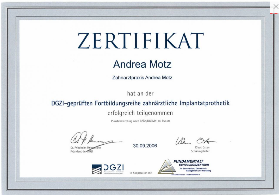 - DGZI Zertifizierung "Implantatprothetik" 2006