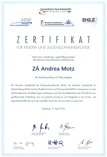 Nach einer zweijährigen theoretischen und praktischen Fortbildung mit abschließender Zertifizierung nach den Richtlinien der DGZMK wurde dieser Schwerpunkt der Kinder- und Jugendzahnheilkunde in meiner Praxis etabliert.
