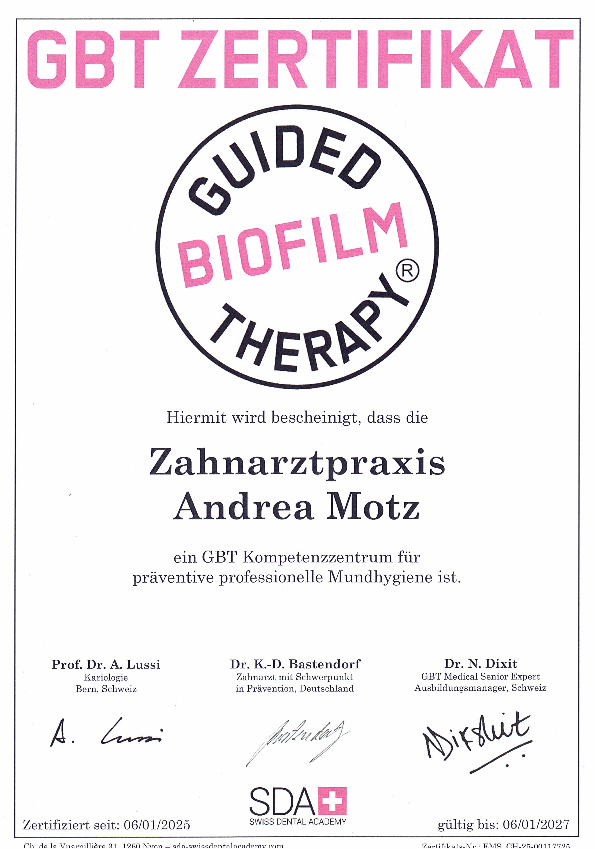 Bei der Medizinischen Zahnreinigung handelt es sich um ein modifiziertes Guided-Biofilm-Therapy-Verfahren (GBT-Verfahren), welches in unserer Praxis durch hochprofessionell geschulte Fachkräfte durchgeführt wird. Alle Fachkräfte haben eine Zusatzausbildung und entsprechende Prüfung absolviert. Durch regelmäßige Nachschulungen und Kontrollen wird sichergestellt, dass die Behandlungsqualität stets erhalten bleibt.